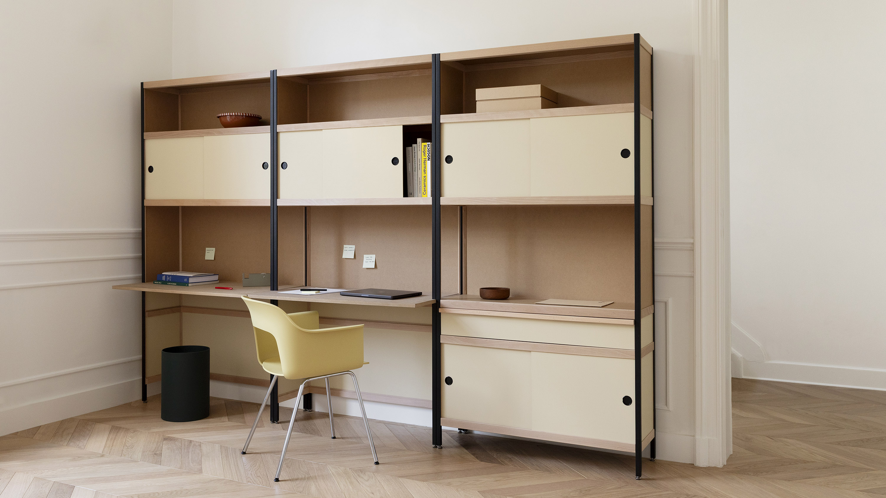 The cantilevered desk has a shelf that completes the system, thanks to a new model of crossbar. The two lower compartments are completely open to give a desk height of 74 cm. The alcove containing the shelf is at least 47 cm high. All the compartments above are fully configurable. The unit must be fixed to the wall, whether used alone or as part of a set.